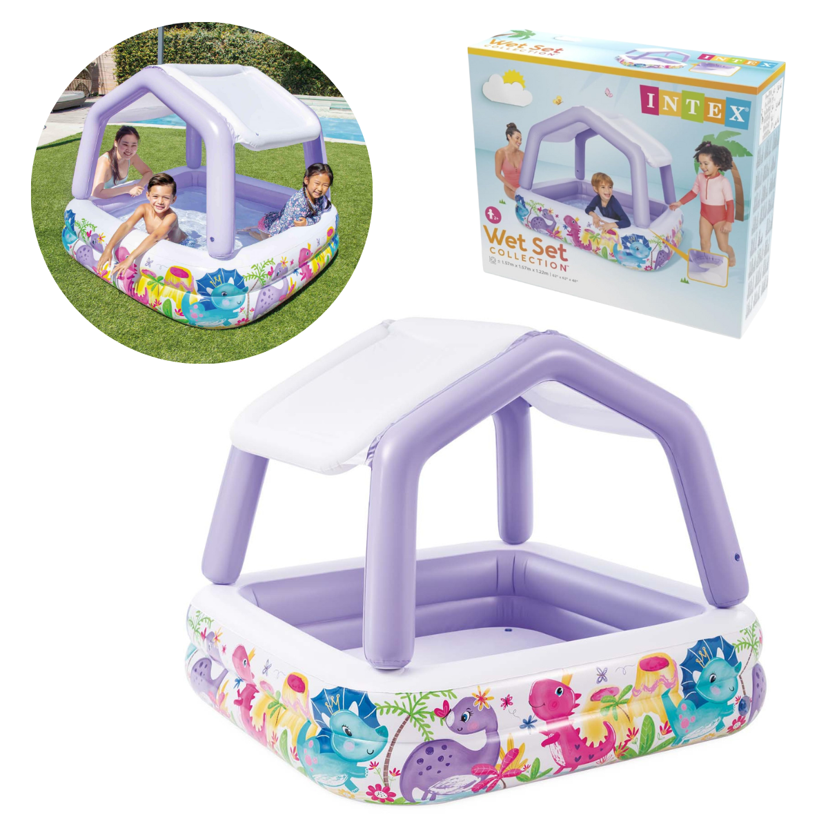 Esta piscina horas de diversão as crianças com total segurança, conforto e proteção solar devido a cobertura removível. Nas cores lilás e branca possui design de animais marinhos divertidos. Possui capacidade de 295 litros, indicada para crianças a partir de 2 anos.